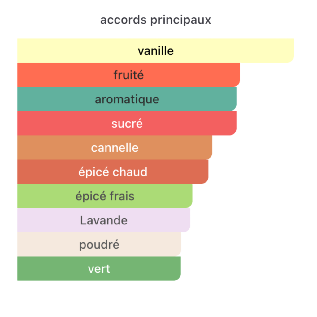 L’ouverture dévoile une poire gourmande associée à la lavande, offrant un contraste frais et addictif. Le cœur révèle une vanille riche et crémeuse, réchauffée par des épices sensuelles. En fond, les bois ambrés apportent profondeur, élégance et une tenue exceptionnelle.